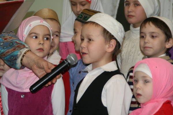 Мәчет каршындагы курсларда белем алучы сабыйлар Коръәннән сүрәләр укыды, нәшидләр һәм мөнәҗәтләр...